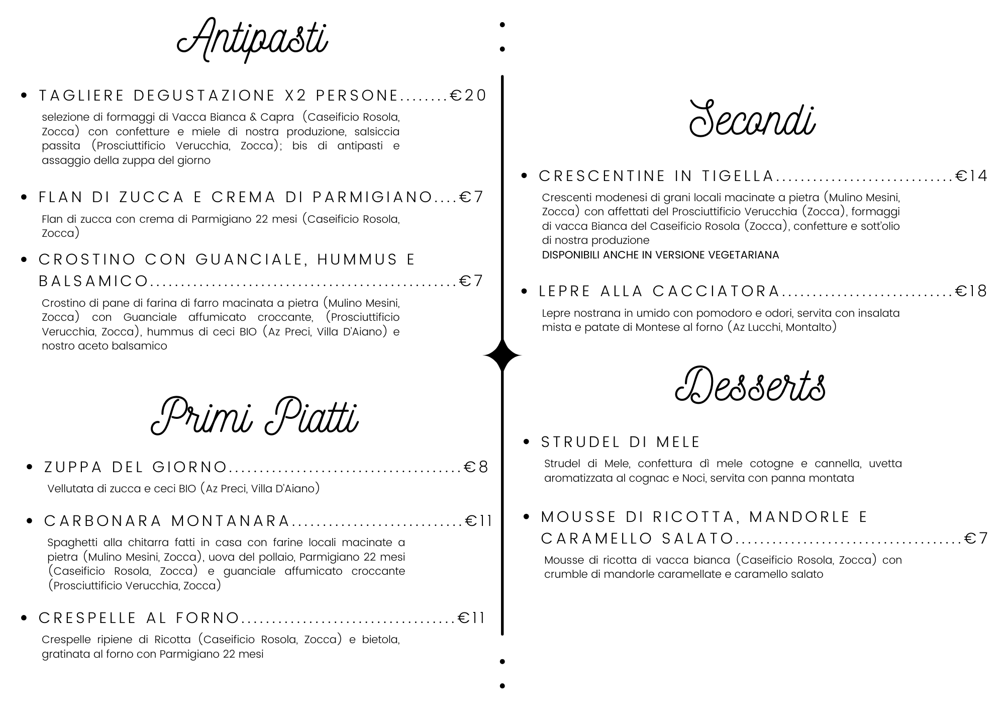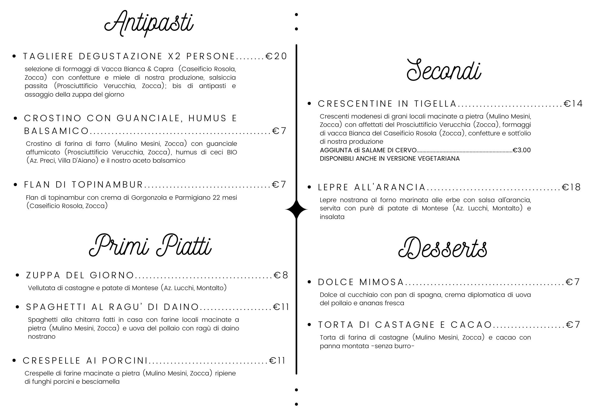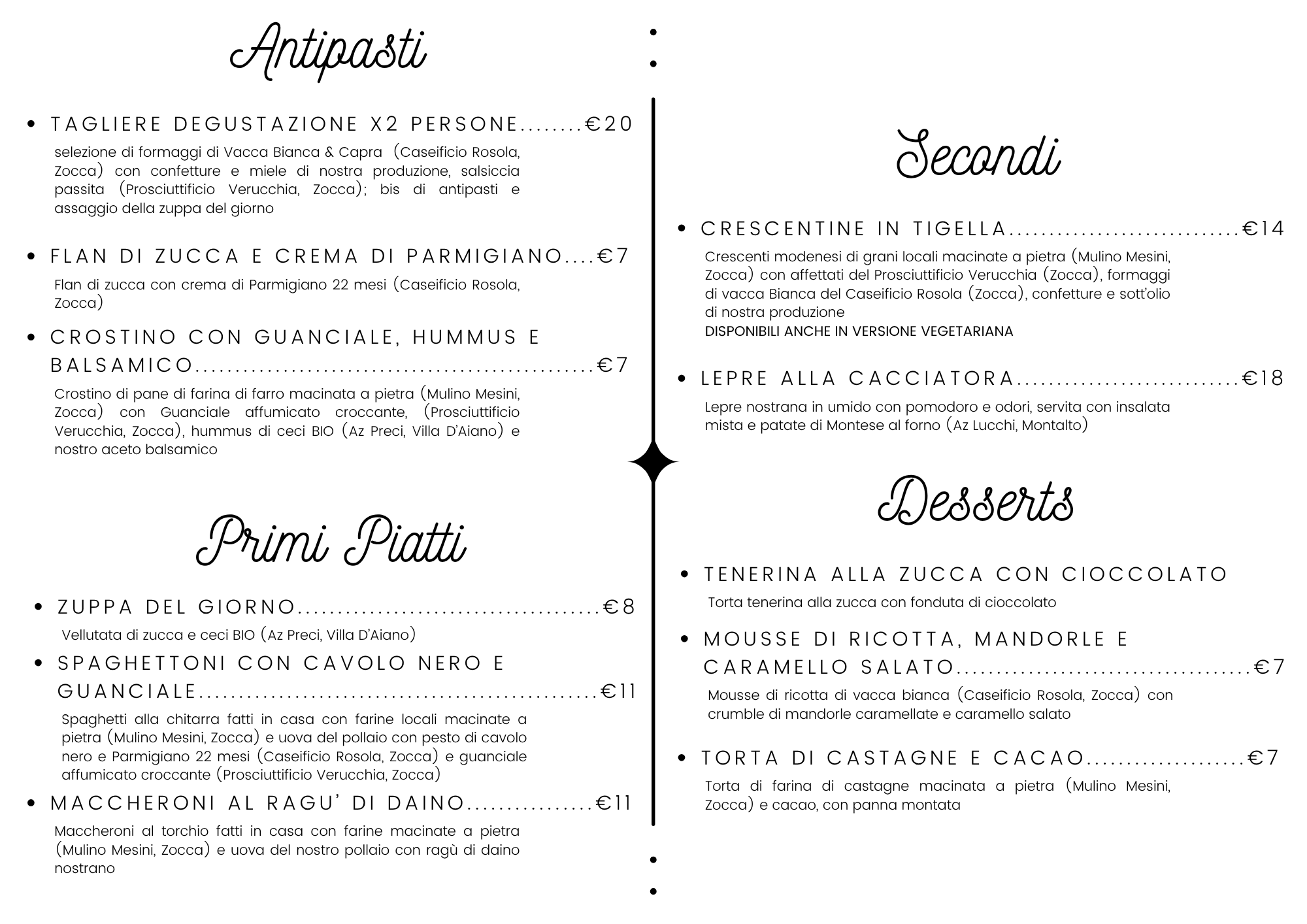 Serviamo solo prodotti freschi di stagione e del territorio, per questo il nostro menu cambia ogni settimana.